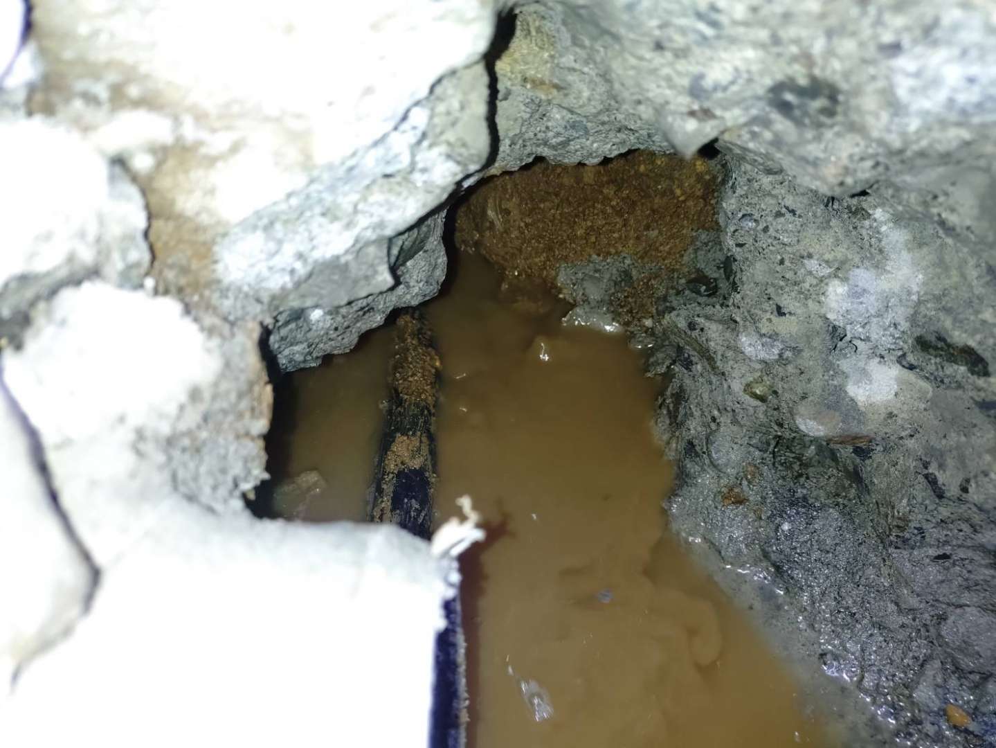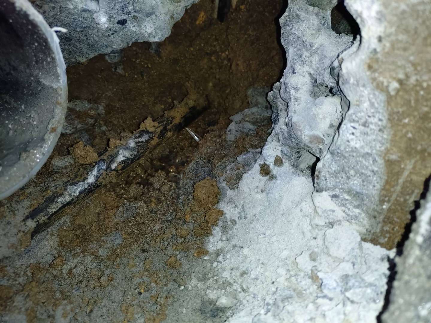 水道検針時に漏水しており、調べた方がいいとのことで連絡を受け、調べた所コンクリートの下から微かな反応があり、犬走りをハツリ掘ると基礎の中から水が流れてきた為、修理不可かと思われたが、漏れの個所が基礎すぐだと分かり浴室の床を壊すよりきその一部を壊したほうが有利と判断。なんとか工具が動かせる大きさに穴を広げ修理することができた案件です。